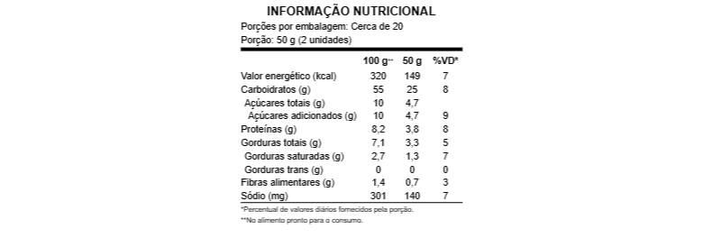 Ingredientes: Farinha de trigo enriquecida com ferro e ácido fólico, fubá, açucar, margarina, sal, fermento biológico