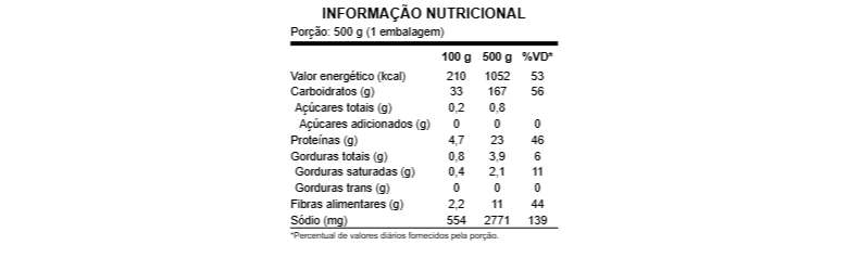 % valores diários com base em uma dieta de 2.000 Kcal ou 8.400 KJ. Seus valores diários podem ser maiores ou menores dependendo de suas necessidades energéticas. (*) Quantidade não significativa