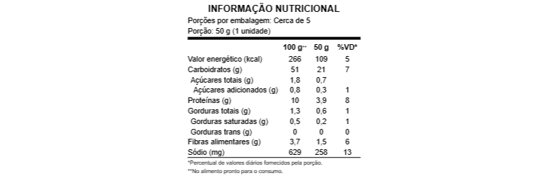 Ingredientes: Farinha de trigo enriquecida com ferro e ácido fólico, farinha de trigo integral, sal e reforçador (ácido ascórbico e/ou peróxido de benzoíla e/ou azodicarbonaida)